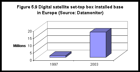 The digital satellite set-top box installed base in Europe will grow from 1.1 million in 1997 to 17.4 million in 2003. (See Figure 5.9) Growth will be strongest in the UK, France, Italy and Spain, where digital pay-TV operators such as BSkyB, Canal Satellite, Tele+ and Via Digital have appealing content packages.