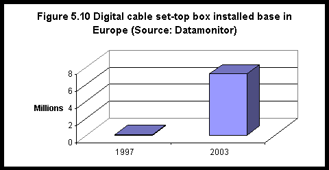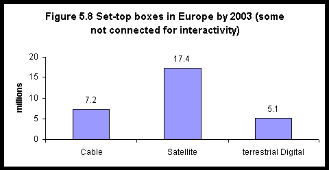 Currently nearly half of European households have cable television (both analogue and digital). Digital cable networks technically offer the best solution for broadband interactive services. But only a small percentage of European households have digital cable networks and many cable companies have still to incur major costs to upgrade their analogue networks. However, the country by country survey in chapter 3 has shown that this upgrading is happening in many European countries. A Datamonitor study predicts that by 2003 there will be 7.2 million cable, 17.4 million satellite, and 5.1 million terrestrial digital set-top boxes in Europe. (Note this is different from enabled households, as some set-top boxes will not be connected for interactivity) (Figure 5.8)