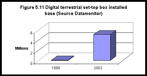For the digital terrestrial set-top box installed base, this will increase from 50,000 in 1998, to 5.1 million in 2003. (Figure 5.11). Datamonitor considers that UK and Sweden are leading digital terrestrial television (DTT) service provision, with a commercial service in the UK from ONdigital and a public service one in Sweden. Uptake will be strongest in the UK and Spain where set-top boxes will be subsidised.
