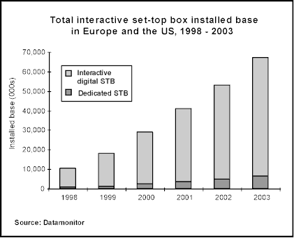 The interactive digital set-top box will dominate the interactive TV market. By 2003, Datamonitor estimates an installed base of 61 million in Europe and the US, almost ten times bigger than the dedicated Internet set-top box installed base (6.3 million).