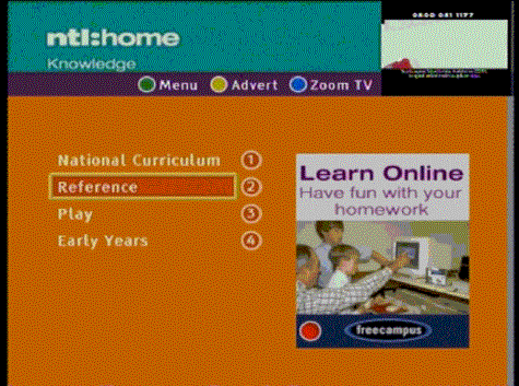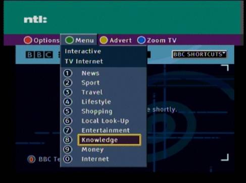 Main menu of the Interactive Services on NTL - with the Knowledge Section selected.