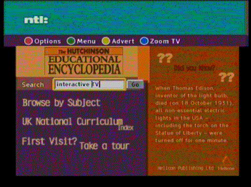 Within the NTL digital cable franchise area in the UK viewers have able to access a reference section within the interactive services of NTL Knowledge. There is a reference section including the Hutchinson Educational Encyclopaedia with a search facility.