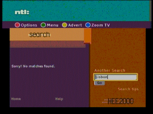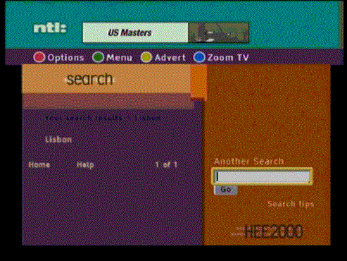 The results of the keyword search on “Lisbon” resulted in a text-based article which can be scrolled down by selecting the down arrow key in the bottom right hand side of the screen and a picture has also been found which when selected can be enlarged. Note also the dynamic advertisement (in this case on betting) at the top of the screen in the NTL banner that can also be selected if desired.