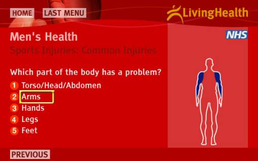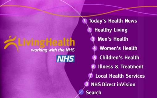 As part of a NHS Direct TV pilot project in the UK, subscribers to Telewest’s digital TV cable service in the Birmingham area through “Living Health” can view information about various aspects of healthcare on their TV sets. Most of the information is in the form of easy to use menus and text but designed for viewing on a TV screen. It is also possible to book an appointment with a doctor at a local surgery.