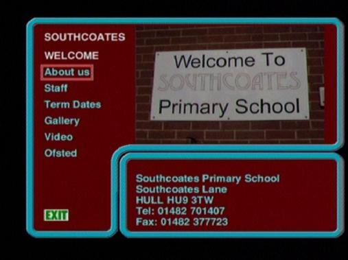 Kingston Interactive TV (KIT) Welcome page of a local primary school. Additional information can be selected from the menu on the left hand side.